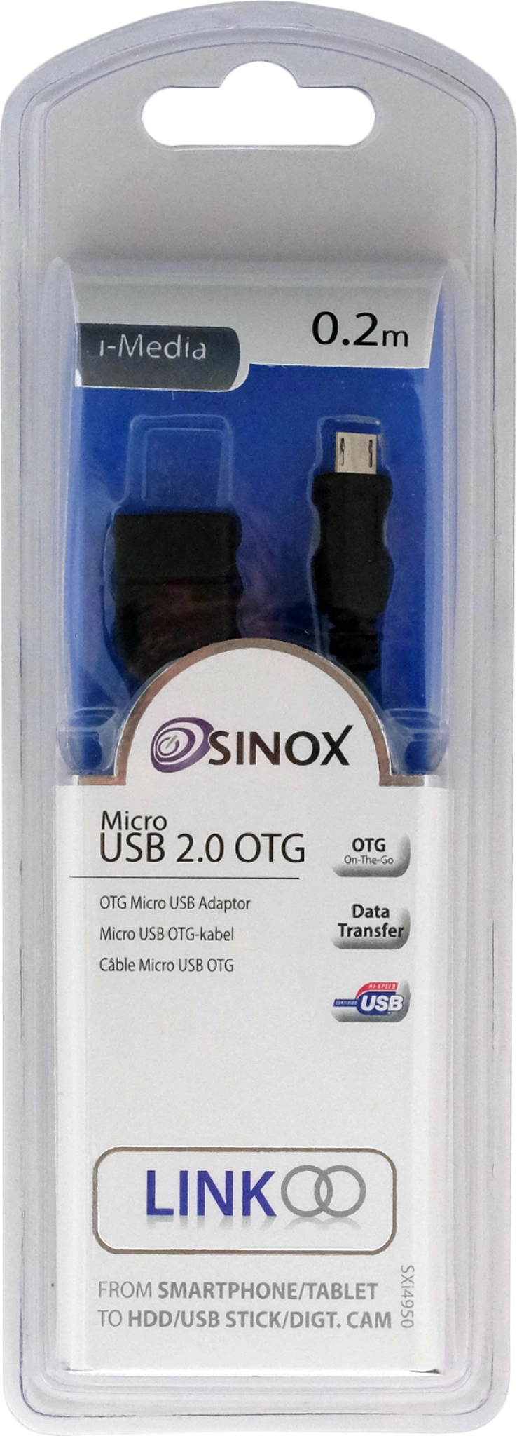 Sinox OTG-adapter används för USB-överföring direkt mellan enheter som mobiltelefoner, handdatorer och musikspelare utan behov av en dator.